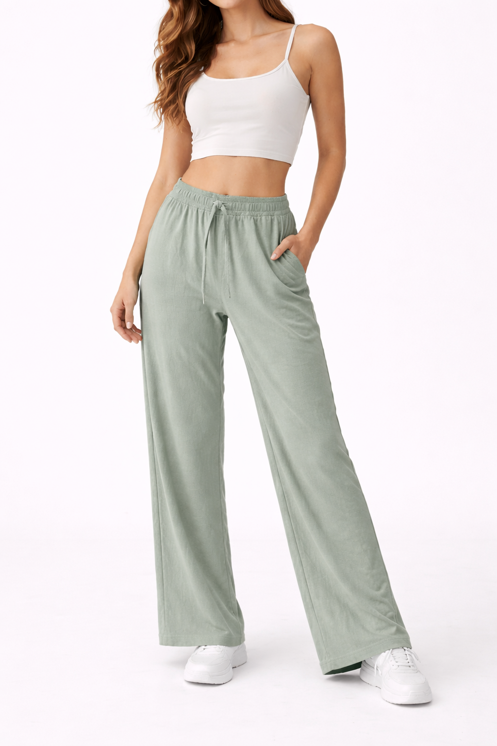 Pantalón cómodo de mujer verde con cintura elástica y cordón ajustable
